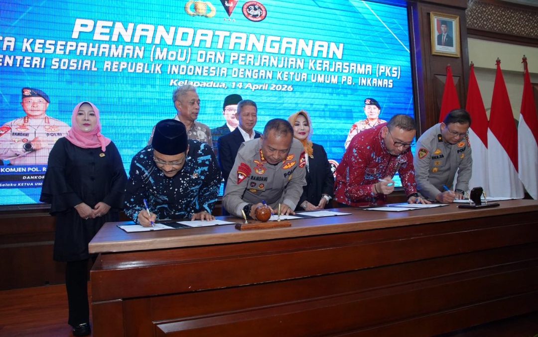 Di Gedung Gineung Pratidina, Mako Korbrimob Polri, Kemensos RI dan PB INKANAS resmi menyatukan kekuatan melalui MoU strategis.